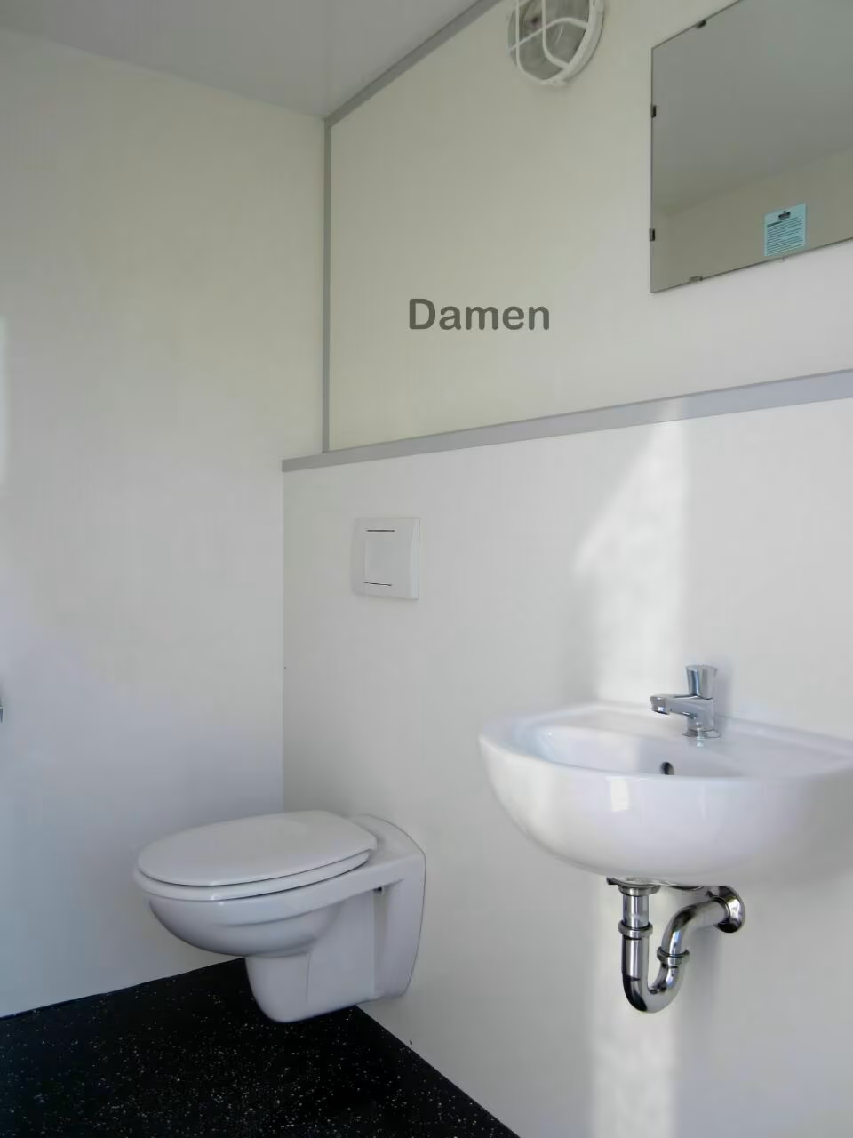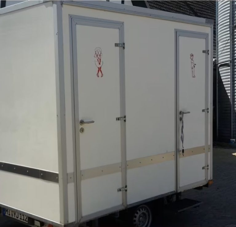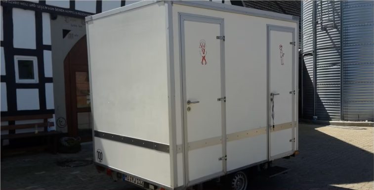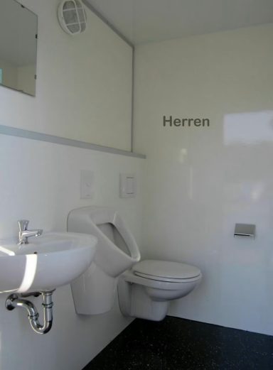Der WC-Anhänger verfügt über zwei separate Eingänge für Damen und Herren. Die Damenkabine ist mit einem WC und einem Waschbecken ausgestattet. Die Herrenkabine verfügt über ein zusätzliches Urinal.